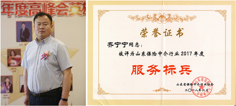 在對2017年度的“雙先表彰”中,山東四方華邦保險(xiǎn)代理有限公司連續(xù)第六年被評為“專業(yè)代理誠信示范單位”,四方華邦濰坊分公司張明杰經(jīng)理被省行業(yè)協(xié)會(huì)評為“保險(xiǎn)中介行業(yè)十佳人物”;泰安分公司齊寧寧經(jīng)理被省行業(yè)協(xié)會(huì)授予“服務(wù)標(biāo)兵”稱號。