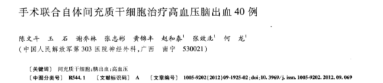 中國人民解放軍第303醫(yī)院神經(jīng)外科進(jìn)行了手術(shù)聯(lián)合自體間充質(zhì)干細(xì)胞應(yīng)對高血壓腦出血臨床試驗,在40例高血壓腦出血受者中,1個月后,觀察組總有效率(95.0%,顯效30例,有效8例,無效2例)明顯高于對照組(75.0%,顯效10例、有效20例、無效10例)(P<0.05)。術(shù)后隨訪6個月,觀察組語言、肌張力和肌力改善情況明顯好于對照組(語言25vs13例,肌張力20vs12例,肌力23vs10例)(均P<0.05)。