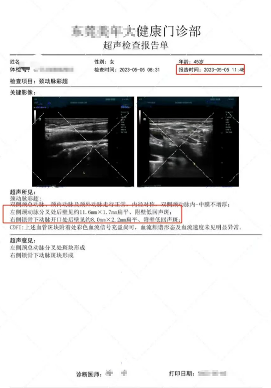 東莞某女士,45歲,2023年5月5日體檢彩超結果顯示,左側頸動脈分叉處后壁見約11.6mmx1.7mm扁平、附壁低回聲;右側鎖骨下動脈開口處后壁見約8.0mmx2.2mm扁平、附壁低回聲斑。左側頸總動脈分叉處斑塊形成,右側鎖骨下動脈斑塊形成。